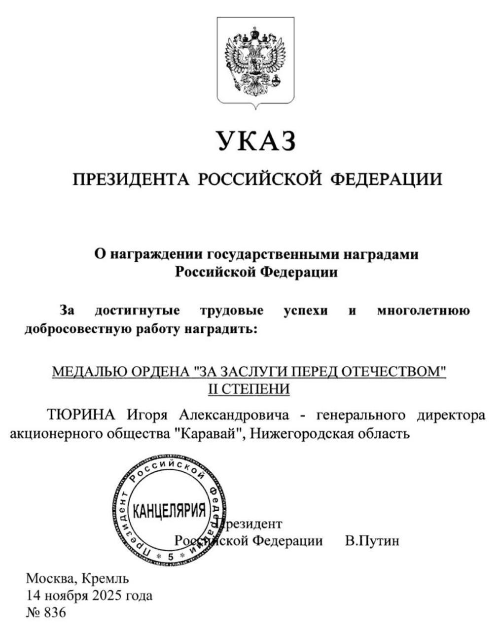 Поздравляем нашего руководителя, Тюрина Игоря Александровича, с высокой государственной наградой Российской Федерации — медалью ордена «За заслуги перед Отечеством» II степени!